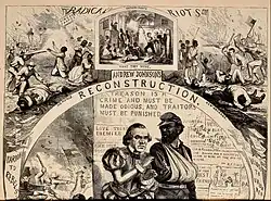 The ebb and flow of Andrew Johnson's historical reputation has often determined the critique of pieces like Amphitheatrum.[32] In particular, during the nadir of American race relations, "when Reconstruction racial and economic policies were viewed with particular disfavor, Johnson emerged the valiant hero who had bravely withstood the evil Radicals,"[18] and Nast was viewed as a useful idiot. For example, the author of A History of American Graphic Humor (1938) argued, "The widespread propaganda to the effect that Johnson was betraying the principles and program of Lincoln inflamed many much older men than the youthful Nast...All the fierce invective and scathing ridicule then at his command were launched at the unfortunate Johnson...Yet Nast quite deliberately and with honest conviction did his share in the vilification of the President. He showed him as a would-be king aiming at absolute power, as a drunken sot, and as a Roman tyrant."[2] Similarly, a 1957 analysis of Nast as crusader artist asserted that Amphitheatrum Johnsonianum was Nast's "most ambitious assault" on Johnson's Presidential Reconstruction but that Nast helped create false impressions of Johnson that "took two generations to correct."[45] Then, beginning in the 1960s, "Once black equality and the injustice of racial discrimination became the prevailing belief, Johnson's historical reputation had no place to go but down."[18] With Johnson's decline came a commensurate ascendance in the evaluation of Nast's Reconstruction-era art, which in 1965 was called "the best record we have of that era of American public life a century ago...Nast spoke to, and for, a vast number of Americans who were ready to believe that the good society lay close at hand...He had a strong sense of the United States as a nation of diverse peoples, welded together by self-government...Not until our own time could Nast's aspirations and his disappointments regain their original evocative power."[46]