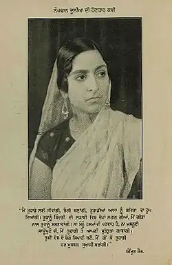 Amrita Pritam was born as Amrit Kaur in 1919 in Gujranwala, Punjab, in British India into a Sikh family.[2][8] She was the only child of Raj Bibi, a school teacher, and Kartar Singh Hitkari, a poet and a scholar of the Braj Bhasha language, and the editor of a literary journal.[9][10] Besides this, he was a pracharak – a preacher of the Sikh faith.[11] Amrita's mother died when she was eleven. Soon after, she and her father moved to Lahore, where she lived till her migration to India in 1947. Confronting adult responsibilities and besieged by loneliness following her mother's death, she began to write at an early age. Her first anthology of poems, Amrit Lehran ("Immortal Waves") was published in 1936, at age sixteen, the year she married Pritam Singh, an editor to whom she was engaged in early childhood and changed her name from Amrit Kaur to Amrita Pritam.[12] Half a dozen collections of poems followed between 1936 and 1943.