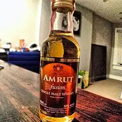 Amrut is a brand of Indian single malt whisky, manufactured by Amrut Distilleries. It is the first single malt whisky to be made in India.[1] Amrut (अमृत) or amrit is a Sanskrit word which can be translated as "nectar of the gods",[2][3] "nectar of life",[4] or "drink of the gods".[5] The company translates it as "Elixir of Life".[6] The brand became famous after whisky connoisseur Jim Murray gave it a rating of 82 out of 100 in 2005 and 2010. In 2010 Murray named Amrut Fusion single malt whisky as the third best in the world.[2][7][8] John Hansell, editor of American magazine Whisky Advocate, wrote that "India's Amrut distillery changed the way many think of Indian whisky – that it was, in the past, just cheap Scotch whisky blended with who knows what and sold as Indian whisky. Amrut is making whisky, and it's very good".[9]