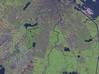 Amstelland includes the green wedge-shaped area that juts into Amsterdam from the south. Extending south of the Utrechtsebrug, this green area has a rural character and remains free of development. It is managed by an organisation called Groengebied Amstelland ("Amstelland Green Area").