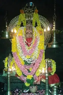 Krishna Shila idol of the goddess Amunthirathamma– an incarnation of Bhadra Kali. Devi is in Ardha padmasana, Andarmugha and Chathur Bahu. The length of the idol is 48 angula (1 angula= 1.76 cm) where the unit, 4 represent the no of Vedas (knowledge) and the digit 8 represents the complete prosperity called Ashtaishwaryam (Dhanya= food, Dhana= wealth, Adhi= creation, Veera= Courage, Vijaya= Victory, Sandhana= Motherly, Gaja= Power, Bhagya= Luck). Her right leg is in mooladhara and left on the lion symbolising Shanthi and courage for the same time. Her right hands hold Thrishoola and Nandhaka while the left hold chakra and Daruka shiras. Temple hold two upabimbas (subsidiary idols) of which one is sreebali vigraha (in standing posture) and the other similar to moola bimba. Moolabimba is dramshtradhara so it doesn't hold a pana pathra which is common in Kaali idols. She holds Simha vahana in idol and Vethala vahana in dwaja.