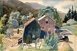 In 1939, Jones was awarded the mural contract for the Painted Post, New York, post office.[9] Her painting, Recording the Victory, shows a group of Revolutionary soldiers who have been captured by a group of Native Americans.[15] That same year, her watercolor, Saranac River was invited for the Art Institute of Chicago's show and a 1940 oil painting When Work is Done was included in an exhibit at the Smithsonian. Some of her works from this period were also reproduced in Life and the Art Digest. Jones taught art classes at Saranac Lake and served on the board of the local craft board and the village art league.[9] In 1941, she painted The Glen Family Spared by French and Indians for the post office in Scotia, New York.[16] In 1943, Jones left Saranac Lake and moved to Mount Kisco, which would remain her home base for nearly forty years.[3] Jones continued painting and exhibiting in both the U.S. and abroad, traveling to several cities in Italy,[17] as well as holding one-woman shows in London and Paris.[6]