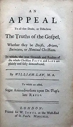 An Appeal to all that Doubt or Disbelieve the Truths of the Gospel, whether they be Deists, Arians, Socinians, or nominal Christians, or An Appeal for short, was written by William Law in 1742. Law lived in the Age of Enlightenment centering on reason in which there were controversies between Catholics and Protestants, Deists, Socinians, Arians etc. which caused conflicts that worried him. The Appeal was heavily influenced by the works of the seventeenth-century German philosopher, Lutheran theologian and mystic writer Jakob Boehme.