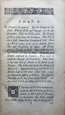 Of creation in general. Of the origin of the soul. Whence will and thoughts are in the creature. Why the will is free. The origin of evil solely from the creature. This world not a first, immediate creation of God. How the world comes to be in its present state. The first perfection of Man. All things prove a Trinity in God. Man hath the triune nature of God in him. Arianism and Deism confuted by nature. That life is uniform through all creatures. That there is but one kind of death to be found in nature. The fallen soul hath the nature of hell in it. Regeneration is a real birth of a divine life in the soul. That there is but one salvation possible in nature. This salvation only to be had from Jesus Christ. All the deist's faith and hope proved to be false.[9]