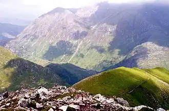 An Gearanach has a subsidiary peak, An Garbhanach ("rough ridge"), which lies 400 metres to the south: the two are connected by a narrow ridge which at one point is quite tricky as it tapers to a knife edge arête dropping into deep glens on either side and requires a good head for heights. There has always been some uncertainty about which is the highest point, with both An Gearanach and An Garbhanach given a height of 3,200 feet on pre metric maps in the 1970s.[8] An Garbhanach reaches a height of 975 metres and in 1921 was accidentally elevated to Munro status and An Gearanach reduced to a "top" due to the vagaries of old fashioned mapping techniques. The mistake was rectified in the 1933 revision of Munro's tables with an explanation that it had all been a mistake.[9] The northern slopes of An Gearanach require some care when descending from the mountain to Glen Nevis and there have been fatalities as walkers have left the stalkers path and tried to descend directly to Glen Nevis and got into difficulties on the crags above the An Steall Ban waterfall.[10]