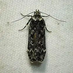 The wingspan is about 12 mm. The forewings are very dark brown, with a white spot on the disc before the middle and two or three small ones behind the middle, and an irregular white fascia posteriorly angulated at the beginning of the cilia. Under the lens, the wing appears to be pretty densely dusted with white and the spots are only aggregations of the dusting.[3]