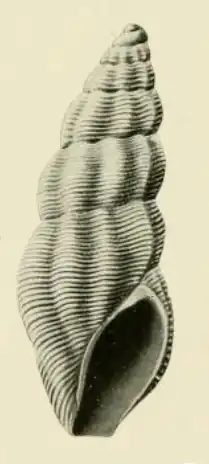 (Original description) The solid, cream-colored shell is narrowly fusiform. It contains seven whorls, including a small, smooth, two-whorled protoconch. The sculpture shows about eight prominent curved ribs that undulate the suture, and extend to the base. These are divided by broad and gently sloping interstices. Across both ribs and furrows run fine, close, spiral threads, amounting to 32 to 36 on the body whorl, and about onehalf that number on the penultimate whorl. Between the threads are microscopic radial bars. The aperture is oval, the anterior notch not apparent. The outer lip is protected by a strong rib-varix. The siphonal canal is short.[2]