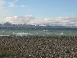 The Anadyr Plateau is roughly 400 kilometers (250 mi) long and about 150 kilometers (93 mi) wide. It is located in the latitude of the Arctic Circle and limited by the Pekulney Range to the east. The average height of the plateau surface is between 700 meters (2,300 ft) and 800 meters (2,600 ft). Lake Elgygytgyn, an impact crater lake is located in a roughly central position.[4] The plateau is largely covered with tundra and shrubs.[3]