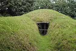 The Anagahayama Kofun is located on the eastern slope of a hill on the left bank of the Yamakuni River, which forms the border between Ōita and Fukuoka prefectures. Designated Anagahana Kofun No.1, it is the main tumulus of a cluster of three ancient tombs. It is an enpun (円墳)-style circular tumulus, with a diameter of 30 meters, surrounded by a six-meter wide horseshoe-shaped moat. It is orientated to the south-southwest. The ten-meter horizontal-passage burial chamber is made of large monoliths. The walls of the passageway and burial chamber are decorated with line-carved murals, and themes include leaf patterns, fish, people, insects, and birds. The leaf pattern is especially large, measuring 52 cm in length, and the veins of the leaf are also expressed. Most decorated kofun, especially in central and northern Kyushu, have painted patterns; whereas line-engraved decorations are more common in Tottori and Shimane Prefectures. The tumulus is thought to have been built between the end of the 6th century and the early 7th century, based on artifacts excavated from 1993 to 1995 and shards of Sue ware pottery.[2] The Anagahayama Kofun is listed in the family registry of Tozato, Kōge District, dated 702, which is preserved at the Shōsōin in Nara. Per this document, it was the tomb of an influential toraijin immigrant clan from mainland Asia who had settled in the area.