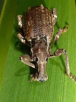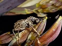 The flax weevil was described by Albert E. Brookes in 1932 based on a series of specimens sent to him by Ernest Richard Fairburn. These were collected at its type locality of D'Urville Island in the Marlborough Sounds in 1931. The type specimen is held at the New Zealand Arthropod Collection. It was described as large and robust in form and ranging in size from 20–24mm.[1] Specimens can range in colour from coppery-brown to dark brown, or even black in older weevils that have lost their scales. They have distinctive pairs of tubercles mid-way along and at the base of the elytra. Larvae are large with a cream coloured body and brown head. The adult is flightless.[2]