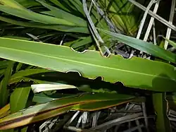 Adults are nocturnal and hide among the dead flax leaves at the base of a plant during the day, emerging at night to feed. Their feeding damage is smooth ovoid notching of the leaf edges; the asymmetrical notches are fibrous and rough, unlike the smooth notches left by the flax notch caterpillar Tmetolophota steropastis.[4] Eggs are deposited at the bases of leaves.[7] Larvae feed by burrowing into flax roots.[5] If disturbed at night, flax weevils characteristically drop from flax leaves onto the ground or stay motionless on leaves.[8]