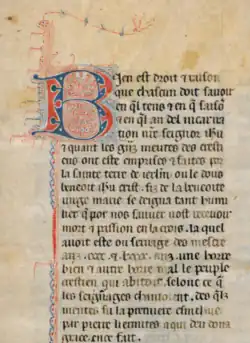 The Old French text survives in at least three manuscript copies, each presenting a different redaction. The earliest—now in Florence, Biblioteca Medicea-Laurenziana, Pluteus LXI.10, folios 1r–8r[4]—was made in late 1290 or early 1291, before the fall of Acre. It is thus an early redaction that does not extend down as far as the others. Its account ends in 1277.[2] The two fuller texts are both now in Paris, Bibliothèque Nationale de France. One, Fr. 24941 (at folios 48–49), is on paper and dates to the 13th century. It goes down to 1291. The other, Fr. 6447 (at folios 369–375), is on parchment and dates to the 15th century. It stops in 1289.[5] It also presents a much more detailed version, but for the period 1270–1289 the two versions diverge substantially.[6] The Florence version contains some unique information not found in the other versions. For example, it alone records how the church of Saint Nicholas outside the walls at Antioch was destroyed when the crusaders prepared to defend the city against a Mongol invasion in 1260.[2]