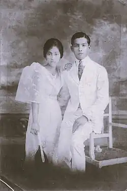 Laico married his third cousin Maria Rosario San Carlos Evidente, the daughter of Don Roman Bernardo Evidente and Doña Roberta Rato San Carlos of Magdalena, on April 11, 1899, at the Santa Maria Magdalena Catholic Church in Magdalena. The Evidente family was also prominent locally. Both Rosario's grandfather and father had been capitanes municipales of Magdalena; her first cousin Maximo Evidente was later presidente municipal of the same town.[11] Ananias and Rosario Laico had ten children altogether, of whom seven survived to adulthood.