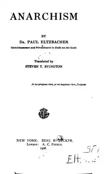 Anarchism is book-length study of anarchism written by Paul Eltzbacher. It was originally published in 1900 and quickly translated into five languages, including English in 1908 by Steven T. Byington.