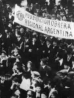 During this period the anarchist movement experienced rapid growth. 50 to 70% of the males in the working class were disenfranchised, because they were not native Argentines. Hence the legal political framework was not an option for them and anarchism gained appeal.[12] The movement's strength and its relationship to the state is demonstrated by the events on May 1, 1904. 70,000 anarchist workers marched in the streets of La Boca (Buenos Aires' total population was of 900,000). Proscribed by Roca's government, the demonstration ended in the death of Juan Ocampo, a teenager.[13]