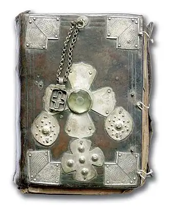 Anchi Gospel is a Georgian manuscript of the Gospel dating back to the 11th-12th centuries and kept in the National Archives of Georgia. Anchi's Gospel is written on parchment, in Nuskhuri script. The front side of the gospel is stamped with silver, decorated with green glass. The holy book is accompanied by a colorful miniature of Matthew the Apostle. The original cover, which is missing, was engraved by Beka Opizari. The Gospel consists of 269 pages, including 3 unwritten pages. At the bottom of the manuscript, there is an inscription, where the copyist of the Gospel, Archbishop Tevdore of Ancha, mentions Davit Soslan, King Tamar, Lasha-Giorgi and Beka, the gold sculptor. The manuscript was brought from the church of Tskarostavi (Klarjeti) by the order of King Tamar and placed in Anchiskhati church.[1][2][3]