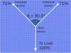 The sum of forces on all the individual anchors will commonly exceed 100%, and in some cases, the force on an individual anchor will be greater than the load. This may seem contradictory when only the magnitudes are summed. However, if the forces on the individual anchors are added as vectors, the resultant force on the anchor system is equal to the load. In simpler terms, the forces in the vertical direction are equal to the load force, but there are lateral forces as well – which increase as the V-angle increases.