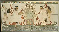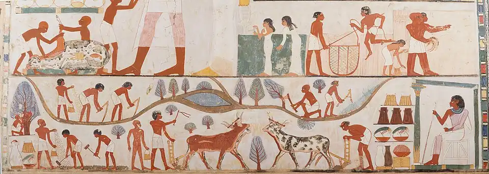 A tomb relief depicts workers plowing the fields, harvesting the crops, and threshing the grain under the direction of an overseer, painting in the tomb of Nakht.