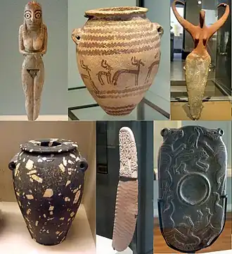 Artifacts of Egypt from the prehistoric period, from 4400 to 3100 BC. First row from top left: a Badarian ivory figurine, a Naqada II jar, a Bat figurine. Second row: a diorite vase, the Gebel el-Arak Knife, a cosmetic palette.