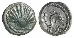 Along the east coast and particularly in the northeast a great number of towns minted silver drachmas. Some of these coins imitate the drachmas of Emporion or Massalia, while others have Iberian legends, a few of which can be related to towns or peoples but many of which are unknown or illegible.[25] This silver coinage is generally seen as minted by the pro-Roman side, particularly as little Roman coin seems to have reached the Peninsula given the concurrent fighting in the Italian Peninsula.[26] But given the fluid situation of the war, particularly in the early years, some of these emissions may have been minted to aid the Carthaginian cause.[27]