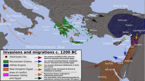 The Sea peoples is the term used for a confederacy of seafaring raiders of the second millennium BC who sailed into the eastern shores of the Mediterranean, caused political unrest, and attempted to enter or control Egyptian territory during the late 19th dynasty, and especially during Year 8 of Ramesses III of the 20th Dynasty.[13] The Egyptian pharaoh Merneptah explicitly refers to them by the term "the foreign-countries (or 'peoples')[14] of the sea"[15][16] in his Great Karnak Inscription.[17] Although some scholars believe that they "invaded" Cyprus, Hatti and the Levant, this hypothesis is disputed.[18]