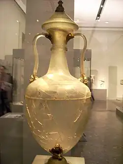 By the 9th century, the raw materials for glass shift again to quartz pebbles and plant ash, the 'forest glass' of medieval Europe. Natron was no longer in use, and the low lime composition of the Bet'eliezer glass could suggest declining access to the material from at least the 6th century onwards.[18] This could, in turn, suggest a shift from natron and raw glass trade toward tighter control over natron and increasing centralised production.
