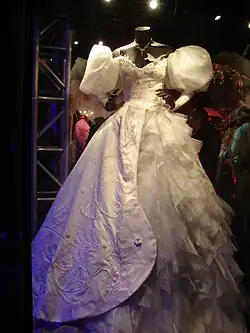 For the character of Giselle, her journey to becoming a real woman is reflected in her dresses, which become less fairy tale-like as the film progresses. Her wedding dress at the beginning of the film directly contrasts her modern gown at the end of the film.[31] The wedding dress served to provide a "humongous contrast to the flat drawings" and to accentuate the image of a Disney Princess.[32] In order to make the waist look small, the sleeves are designed to be "extremely pouffy" and the skirt to be as big as possible, which included a metal hoop that holds up twenty layers of petticoats and ruffles.[33] Altogether, eleven versions of the dress were made for filming, each made of 200 yards (183 m) of silk satin and other fabric, and weighing approximately 40 pounds (18 kg).[31][33] On the experience of wearing the wedding dress, Amy Adams described it as "grueling" since "the entire weight was on her hips, so occasionally it felt like she was in traction".[34]