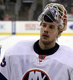 On 27 April 2011, the New York Islanders signed Nilsson to a three-year entry-level contract.[1] He was initially assigned to the Islanders American Hockey League (AHL) affiliate, the Bridgeport Sound Tigers.[2] Nilsson was recalled by the Islanders after Evgeni Nabokov was injured in a game against the Montreal Canadiens.[3] He made his NHL debut on 19 November 2011, against the Boston Bruins, in relief of Rick DiPietro. He let in 3 goals on 17 shots, while playing 40 minutes, as the Islanders lost 6–0. He got his first start in the NHL on 21 November 2011, against the Pittsburgh Penguins at Consol Energy Center in Pittsburgh, Pennsylvania. On 4 March 2012, he earned his first NHL victory and shutout in a 1–0 home win against the New Jersey Devils. In doing so, he became the first goalie in Islanders history to record a shutout for his first win.[4] In his next start, on 10 March 2012, he almost shutout the Devils a second time, but the Devils scored two goals in the last two minutes of the game, resulting in a 2–1 loss for the Islanders.[5]