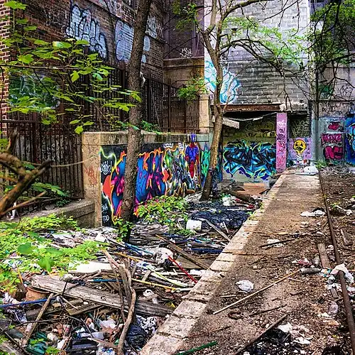 Although the station is no longer accessible, the site is home to many pieces of graffiti. Trash also litters the station and trees are sprouting where the tracks formerly lay. This station used to be accessible, although the route is not intended for use, through the Sedgwick Avenue station. A footbridge connects with an abandoned park, where the tunnel used to be open to urban explorers.[8] Today, however, the entrance is boarded up, and fences are placed with the intention to deter intruders. The building atop which the station sits is still visible at the intersection of East 162nd Street and Jerome Avenue.