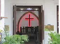 The church has an exterior with brick walls, stained glass windows and Chisholm styled dome. The altar houses conventional Methodist images and a prayer hall for the devotees. The plaques of Anderson and Jesus Christ are housed in glass chambers in standing posture on the walls facing the devotees. The college hall, which would go on to become the assembly hall of the church, is plastered with shingles. The church is declared a landmark heritage building by the Tamil Nadu Chapter of Indian National Trust for Art and Cultural Heritage (INTACH).[1] It was also on the Phase I list of Heritage buildings in Chennai under the Chennai Metropolitan Development Authority (CMDA).[2]
