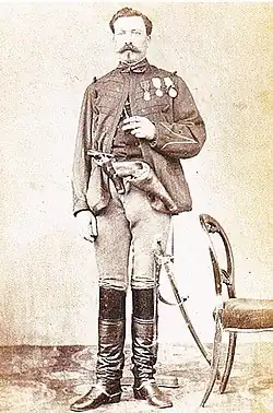 In 1868 the Boshin War broke out between the Shōgun and the forces supporting the restoration of the Mikado's authority. The foreign powers in Japan, including France, declared neutrality in the conflict. Cazeneuve therefore resigned from the French army and entered the service of the shōgun, along with Jules Brunet. He was commissioned as a captain.