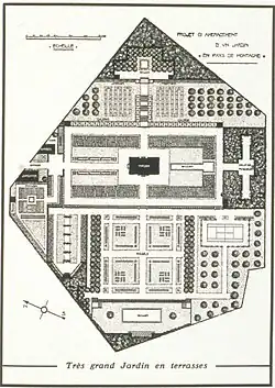Les Jardins (1919) further defined the "regular" modern garden.[15] The American landscape architect Fletcher Steele found that Vera's book "of cubist-dada influence" was "decidedly worthwhile", but mainly due to "the droll woodcuts by M. Paul Vera with which they are illustrated." Steele dismissed Vera's innovations on the basis that he "seems to glorify the curious and original rather than the beautiful."[16] Vera criticized the historical revival of Achille Duchêne. He also felt that the imitation of nature in landscape gardens was artificial. He asserted that garden designs had to be based on the laws of mathematics and geometry, using the golden section and simple forms such as squares and triangles.[17] In 1920 Vera designed a garden for his house in Saint-Germain-en-Laye, working with his brother Paul. The rigidly symmetrical and geometrical design combined classical and modern elements, using topiary, vegetation carefully selected for its colors, and new materials such as reinforced concrete.[14]