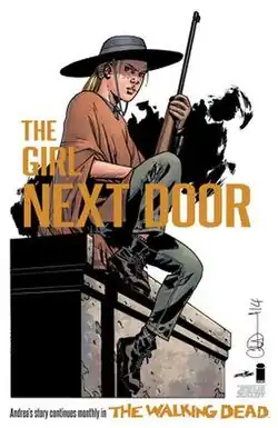 As a main character of the comic book series, Andrea appears in every single volume. The character is introduced in issue two of The Walking Dead in the "Days Gone Bye" storyline on November 12, 2003[2] while her first prose appearance is issue five on February 1, 2004[3] as a survivor of the zombie apocalypse. A former file clerk, Andrea is a head-strong and independent young woman beginning to find her place in the world. During the initial stages of the outbreak, she and her younger sister Amy are getting back from a road trip and heading towards Amy's college, when they are stranded and eventually picked up by fellow survivor Dale. They set up camp together on the outskirts of Atlanta, Georgia, where they are soon joined by other survivors. The group members learn to handle guns, and Andrea discovers that she is an excellent marksman. When zombies invade the camp, Amy is bitten. A distraught Andrea shoots her sister to ensure that she does not return as a zombie.[4] The group moves on, first to a gated community named Wiltshire Estates where Andrea and Dale engage in sex and thus begin a relationship.[5] Following their desertion from the community, they end up at a farm, where they enjoy temporary peace.[6] While there, Andrea makes continued failed attempts at consoling Allen and is concerned for the well-being of his children. No sooner after their arrival are they ousted from the farm by Hershel, and soon afterward while on the road she and Dale discover a path leading to a prison facility.[7]