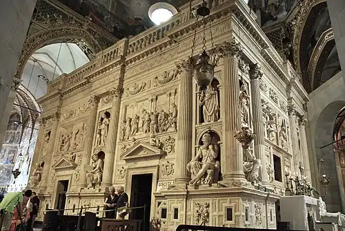 In 1504 Sansovino was invited to Rome by Pope Julius II to make the monument of Cardinal Manzi in Santa Maria in Aracoeli (influenced by the Lombard style of Andrea Bregno) and those of the Cardinals Ascanio Maria Sforza and Girolamo Basso della Rovere for the retro-choir of Santa Maria del Popolo. The architectural parts of these monuments and their sculptured foliage are extremely graceful and executed with the most minute delicacy, but the recumbent effigies show the beginning of a serious decline in taste. These tombs became models which for many years were copied by most later sculptors with increasing exaggerations of their defects.[1]