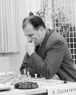 Andreas Dückstein (2 August 1927 – 28 August 2024) was an Austrian chess master. He was awarded the International Master title in 1956 and Honorary Grandmaster title in 2024. Dückstein was regarded as a dangerous attacker, as a win against World Champion Mikhail Botvinnik demonstrated.