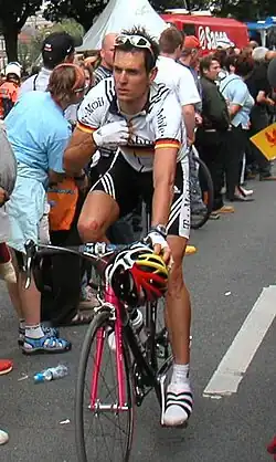 Andreas Klöden (born 22 June 1975) is a German former professional road bicycle racer, who competed as a professional between 1998 and 2013.[3] His major achievements include a bronze medal at the 2000 Olympic Games and finishing second in the general classification at the 2004 and 2006 Tour de France. Klöden was a tall, lightly built racer with enough strength to place high in the overall classifications of the Grand Tours, but his performances were affected by injuries.