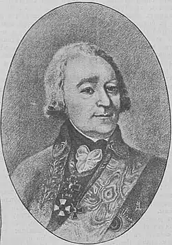 The Russian branch of the Miloradovich family was established in 1715, when Mikhail Miloradovich (the first) (Serbian Cyrillic: Михаило Милорадовић), one of three brothers recruited by Peter I to incite rebellion against the Turks four years earlier, fled from Herzegovina to Russia and joined Peter's service as a colonel.[12][13] He was a commander of the Hadiach Regiment. Towards the end of Peter's reign he was imprisoned in connection with Pavlo Polubotok's treason case, but was spared from further misfortune by Peter's death. His grandson Andrey served thirty years in the Russian Army and later moved into civil administration as the Governor of Little Russia and the Chernigov governorate.[12] After graduating from the Kiev Theological Academy, he entered the military service in Little Russia, and in 1747 he received the title of ensign; in 1749, he was promoted to a lieutenant of a Life Guards company.[14] The Seven Years' War with Prussia from 1756 until 1762 gave Miloradovich a chance to show his courage, and gain several ranks on the field of honor, particularly in the battles of Kay, Kunersdorf and the Siege of Kolberg. In 1771 during the Russo Turkish War Brigadier Miloradovich, fighting under the command of Pyotr Rumyantsev, distinguished himself in the very first campaign.[15] Rumyantsev's 1800 infantry soldiers and 300 Cossacks crossed the Danube and defeated a Turkish force of 7,000 at Măcin in the Dobrudja region of Romania. Rumyantsev, in his report to Empress Catherine II, wrote the following about the battle: