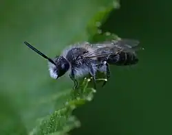 The bearded miner bee is commonly around 11 mm in length, the males being smaller and slenderer than the females.[6] The females have rufous hairs on the dorsal surface of the thorax which contrast with the yellower hairs on its sides and head. The males can appear silvery in colour because of the long pale hairs on their thorax.[7] The integument is largely black.[2] It has a narrow head which gives this species a rather hunch-backed appearance.[8]