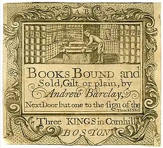 Barclay was one of a group of Scottish bookbinders and booksellers who, at the age of 21, emigrated to the colonies and worked in Boston before and during the War for American Independence. His brother John arrived at Boston six years thereafter.[4] A small percentage of bookbinders ever distinguished their work by including their signature trade label on the inside cover of the works they bound. Subsequently, bookbinder's trade labels are seldom found in the various works that were published in eighteenth-century colonial America. The various works bound by Andrew Barclay containing such labels are considered among the rare exceptions to that advent, with only a few known surviving examples.[1] Historians in this field have searched the rare book departments in various public and university libraries for these labels and have only found several examples. They maintain that the books containing binder's trade labels have largely gone unnoticed or unidentified and hope that more examples are yet to be found pending continued searches.[5]