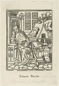 He finally settled at Montpellier and before 1542 had completed his Fyrst Boke of the Introduction of Knowledge, which ranks as the earliest continental guidebook, his Dietary and his Brevyary. He probably returned to England in 1542, and lived at Winchester and perhaps at Pevensey. John Ponet, bishop of Winchester, in an Apology against Bishop Gardiner, relates as matter of common knowledge that in 1547 Doctor Boord, a physician and a holy man, who still kept the Carthusian rules of fasting and wearing a hair shirt, was convicted in Winchester of keeping in his house three loose women. For this offence, apparently, he was imprisoned in the Fleet, where he made his will on 9 April 1549. It was proved on the 25th of the same month. Thomas Hearne (Benedictus Abbas, i. p. 52) says that he went round like a quack doctor to country fairs, and therefore rashly supposed him to have been the original Merry Andrew.[1]