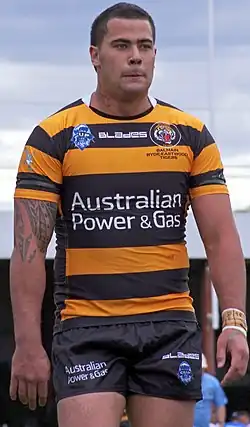 As a teenager, Fifita trialled with the Sydney Roosters and the North Sydney Bears, but was considered lightweight, even though he was playing as a winger or centre at the time. Fifita said he, "tried eating and all that stuff but it didn't work and then one day I just blew out. It wasn't until I was 17 or 18 that I put the size on. Maybe it was the grog, I don't know. I was seriously pushing to get to 80 kg back then. I think I was about 70 kg."[5] Fifita would eventually sign with the Wests Tigers and later played in their NYC team in 2009, including playing at prop in the 2009 NYC Grand Final against the Melbourne Storm in the 22–24 loss.[6]