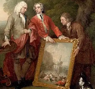 Detail of Conversation Piece (Portrait of Sir Andrew Fountaine with Other Men and Women) by William Hogarth, c. 1730–35 – Fountaine is probably the figure on the far left, with a red sash and his left hand tucked into his brown jacket.[1]