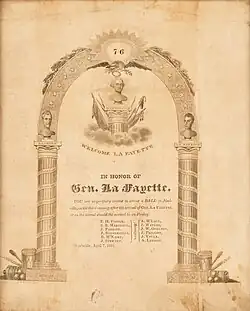 Ralph E. W. Earl (who was a nephew-by-marriage has been described as Jackson's "court painter") designed this invitation to a ball at Nashville in honor of the visit of the Marquis de Lafayette to the United States in 1825; "the invitation occupied the space between two fine columns, one supporting a bust of Jackson and entwined with a ribbon bearing the names of his battles and having the figures 1813–15 inscribed on the pedestal; the other supporting a bust of Lafayette and bearing likewise the names of his battles and the figures 1777–81. At the base of the columns were laying cannon and cannon balls, drums, torches, etc. Above was the sun with 76 in the center, and around were the thirteen stars in the sky. Just below the sun was an eagle holding arrows in one claw and the branch of peace in the other, and placing with its beak a laurel wreath upon the head of Washington's bust, which was supported by a column in the midst of clouds and encircled by swords, spears, banners and the cap of liberty."[7]