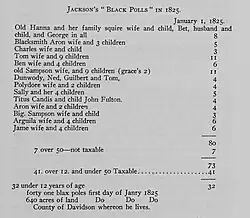 Jackson wrote up a list and a revised list of taxable enslaved property held at the Hermitage during the 1824 tax year. There are other lists of Hermitage slaves but the 1825 list is the only one written in Jackson's handwriting. In 1824 Jackson legally owned 80 people.[31] Volume six of The Papers of Andrew Jackson, edited at the University of Tennessee and published 2002, substantially annotates these lists, identifying the children, providing capsule biographies, and listing vital dates.