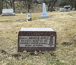 Andrew O. Apple (January 30, 1845 – June 7, 1890) was a United States soldier and native of Pennsylvania who fought with the Union Army as a member of the 12th West Virginia Volunteer Infantry Regiment during the American Civil War. He was recognized with his nation's highest award for valor, the U.S. Medal of Honor, for "conspicuous gallantry as color bearer in the assault on Fort Gregg" during the Third Battle of Petersburg, Virginia, on April 2, 1865. The award was conferred on May 12 of that same year.[1]