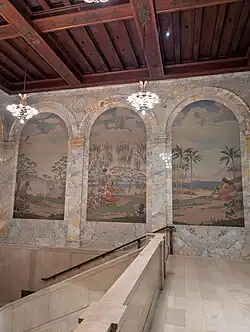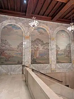 In 1931, Schwartz was commissioned by the architects Wight and Wight to create murals for the Nelson-Atkins Museum of Art in the Atkins stairway.[5] The architects and Schwartz were inspired by the Pierre Puvis de Chavannes gallery and stairway at the Boston Public Library.[6] Schwartz's murals represent, from the north wall moving left to right: Primitive Art, Chinese Art, Egyptian Art, Truth; from the south wall moving left to right: Beauty, Greek Art, Roman Art, Renaissance Art; and from the east wall moving left to right: Byzantine Art, The Genius of Art, and Gothic Art.[7]