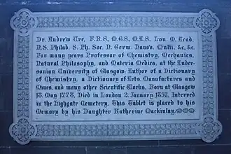 He is buried in the Terrace Catacombs of Highgate Cemetery.[18] A secondary memorial was erected in Glasgow Cathedral by his daughter, Katherine MacKinlay. His eldest son, Alexander Ure (1808 - 13 June 1866), one of the senior surgeons of St. Mary's Hospital, Paddington, is also buried at Highgate Cemetery.[18]