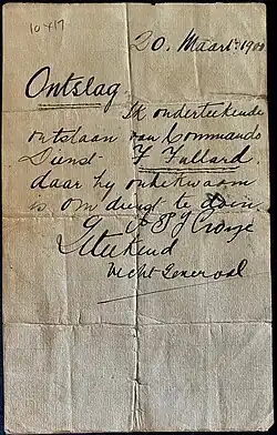 A.P.J. succeeded together with commander Diedericks to force Methuen's troops near Boshof to retreat,[9] but without destroying the railways they then retreated themselves to a defensive position on the Vaal River.[10] General Sarel du Toit requested A.P.J. to help beating back the British attack at Veertien Strome (Battle of Veertienstrome/Fourteen Streams, 3–5 May 1900, near Warrenton) but the British had won there before A.P.J. could answer.[11] Later A.P.J. surrendered to the British army on 14 June 1900 and became - with generals like Piet de Wet, the brother of General Christiaan de Wet - a leading figure in the British National Scouts Corps, helping them against the Boer guerrilla army for the remainder of the war.