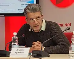 Andriy Viktorovych Kulykov (born 1957) is a Ukrainian journalist, editor, television and radio presenter, actor, media expert, and media editor.[1][2][3] He is widely known in Ukraine as the former host of Freedom of Speech (ICTV), a popular political talk show broadcast on ICTV,[4] but he also been involved with the BBC, Hromadske Radio, and other news media publications and broadcasters. Kurlykov is also a professional English-Ukrainian language Translator-referent.[5] He has been involved in the journalistic effort to explain the Russian invasion of Ukraine to English-speaking audiences.[6][7] On March 1, 2022, Kulykov was broadcasting live from his apartment when the Russian military bombed the Kyiv radio transmission tower.[8] Kulykov also demanded the release of captured Ukrainian journalist Maksym Butkevych, publicly pleading the case for his safe return to Ukraine.[9]