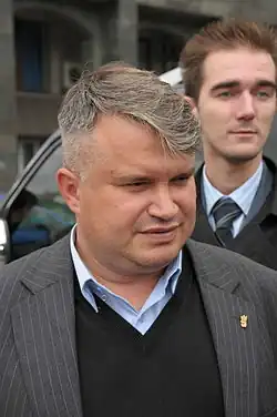 Andriy Volodymyrovych Mokhnyk (Ukrainian: Андрій Володимирович Мохник) is a Ukrainian politician, Deputy Chairman of the right-wing All-Ukrainian Union "Freedom" party, and a former Minister of Ecology and Natural Resources of Ukraine .